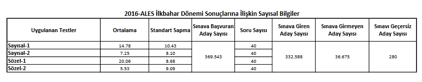 8 Mayıs 2016 tarihinde uygulanan Akademik Personel ve Lisansüstü Eğitimi Giriş Sınavının (2016- ALES İlkbahar Dönemi) değerlendirme işlemleri tamamlanmıştır.