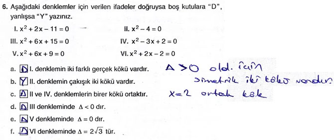 6. Aşağıdaki denklemler için verilen ifadeler doğruysa boş kutulara “ D ” , yanlışsa “ Y ” yazınız.