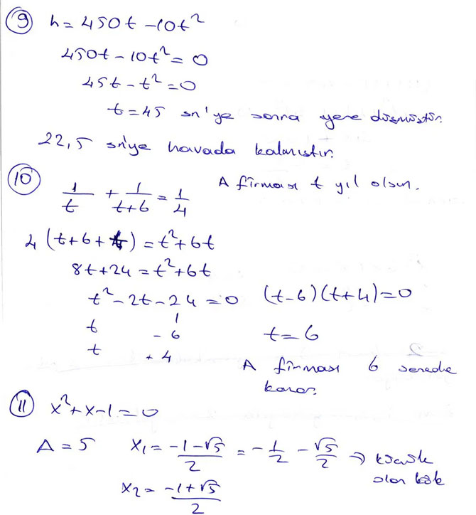 9. Batan bir gemiden yaşam botu ile kurtulan bir kazazede, botta bulduğu işaret fişeğini ateşlemiştir. Ateşlendikten t saniye sonra fişeğin yerden yüksekliği, h = 450 t – 10 t 2 ifadesi ile bulunabiliyorsa fişek kaç saniye havada kalmıştır? Neden?