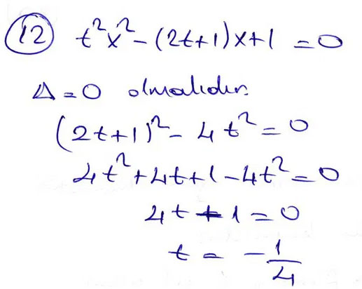 12. t ≠ 0 olmak üzere, t 2 x 2 – ( 2 t + 1 ) x + 1 ifadesinin tam kare olması için t kaç olmalıdır?