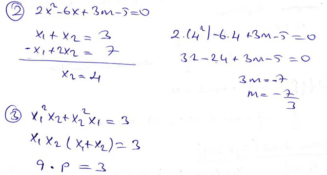 2. 2x2 – 6x + 3m – 5 = 0 denkleminin kökleri x1 ve x2 dir. Kökler arasında x1 + 2x2 = 7 bağıntısı olduğuna göre m değerini bulunuz.