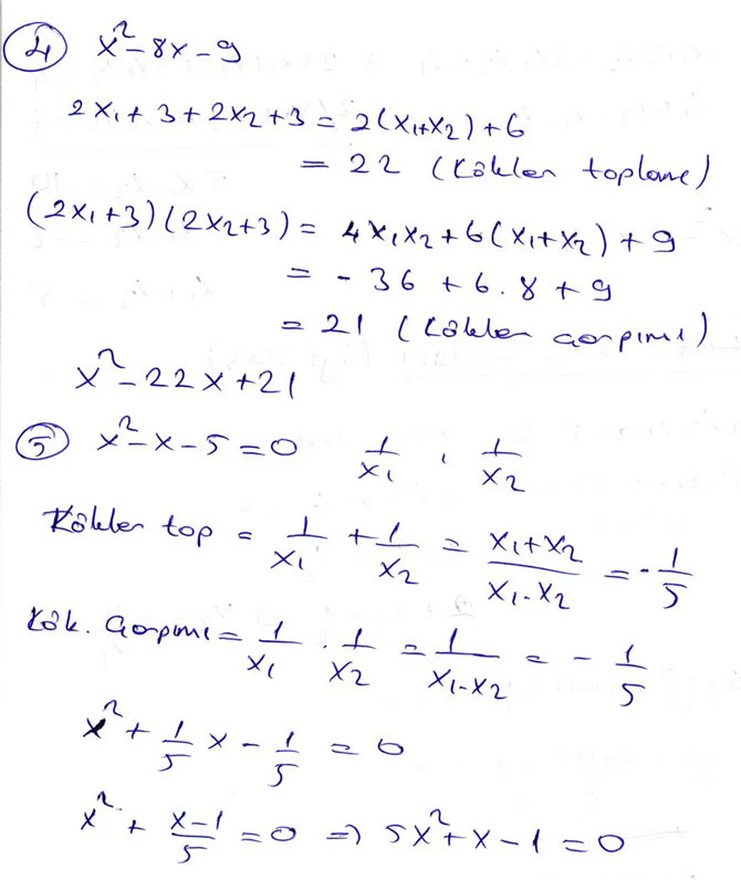 4. x2 – 8x – 9 = 0 denkleminin kökleri x1 ve x2 ise kökleri 2x1 + 3 ve 2x2 + 3 olan ikinci dereceden denklemi yazınız.
