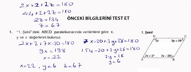 1. “ 1. Şekil ” deki ABCD paralelkenarında verilenlere göre x, y ve z değerlerini bulunuz.
