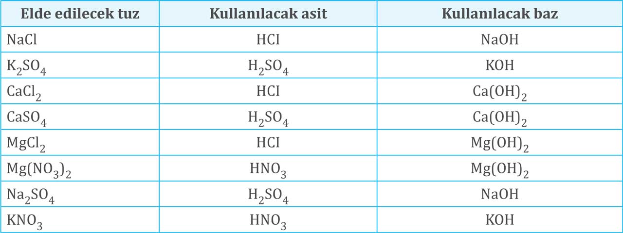 Asitler ve bazlar pek çok maddeyle tepkimeye girebildiği gibi kendi aralarında da tepkimeye girer. Asitlerin bazlarla verdiği tepkimeler sonucunda tuz ve çoğunda da su açığa çıkar. Bu tepkimelerde asidin anyonu ile bazın katyonu birleşince tuz bileşikleri oluşur Buna göre aşağıdaki tabloda verilen tuzları elde etmek için kullanılması gerekli olan asitleri ve bazları kutucuklara yazınız.