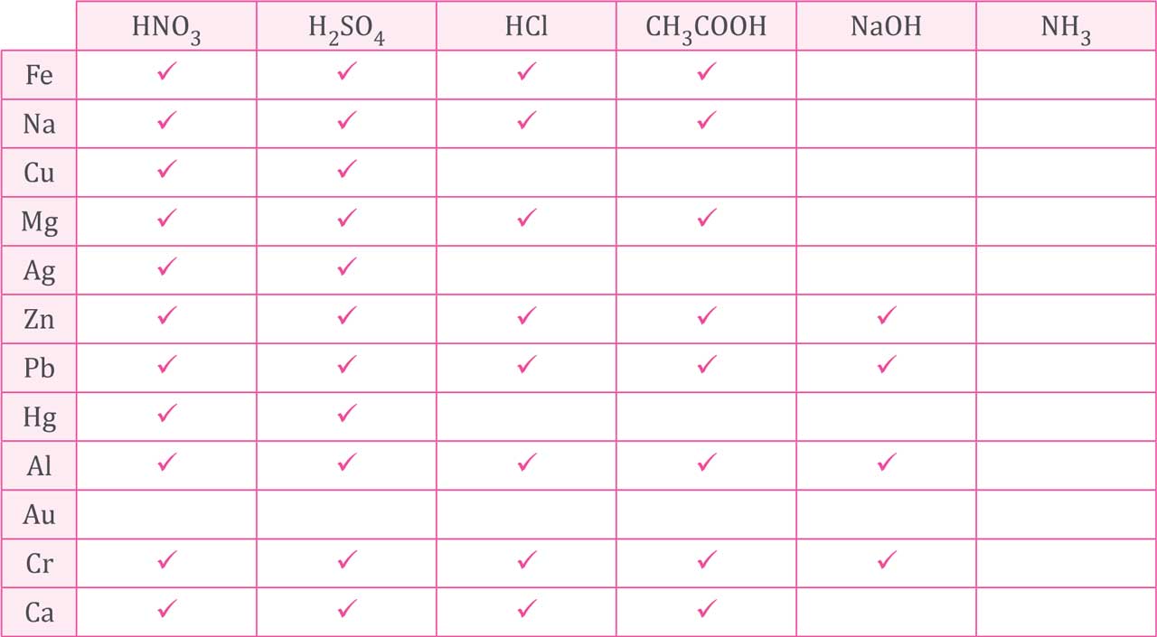 Elementler ailesinin çoğunluğunu oluşturan üyelere sahip metalleri, özelliklerine göre sınıflandırmamız mümkündür. Tek başına asitlerle tepkimeye girmeyen metaller soy metal, sadece oksijenli ve kuvvetli asitlerle tepkimeye giren metaller yarı soy metal, bunların dışında kalan diğer metaller ise aktif metal olarak adlandırılır. Hem asitlerle hem de kuvvetli bazlarla tepkimeye giren metallere ise amfoter metal adı verilir. Aşağıdaki tabloda bazı metallerle birlikte bazı asit ve baz çözeltileri verilmiştir. Bunları inceleyiniz ve metallerin tepkime verdiği çözeltilere ait olan kutucukları işaretleyiniz. (HNO3, H2SO4 ve HCl kuvvetli asit; CH3COOH zayıf asit; NaOH kuvvetli baz; NH3 zayıf bazdır)