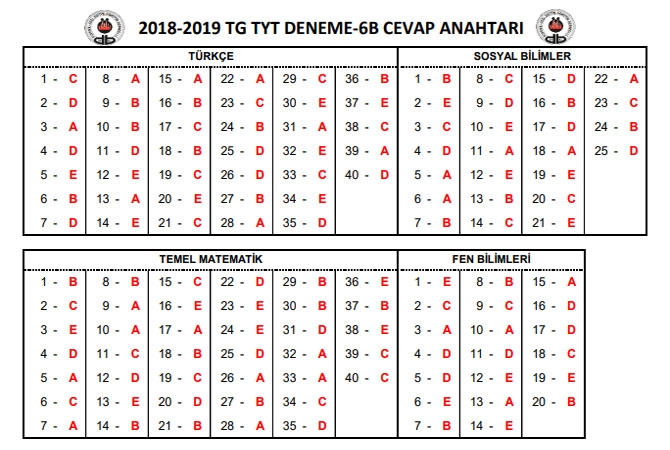 TYT Denemesi B Kitapçığı Cevap Anahtarı