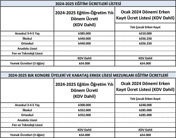 BJK - Kabataş Vakfı Özel Okulları eğitim ve yemek ücretleri- Eğitim ve yemek ücretleri 1 Şubat, 1 Mart ve 1 Nisan 2024 tarihinde güncellenecektir.