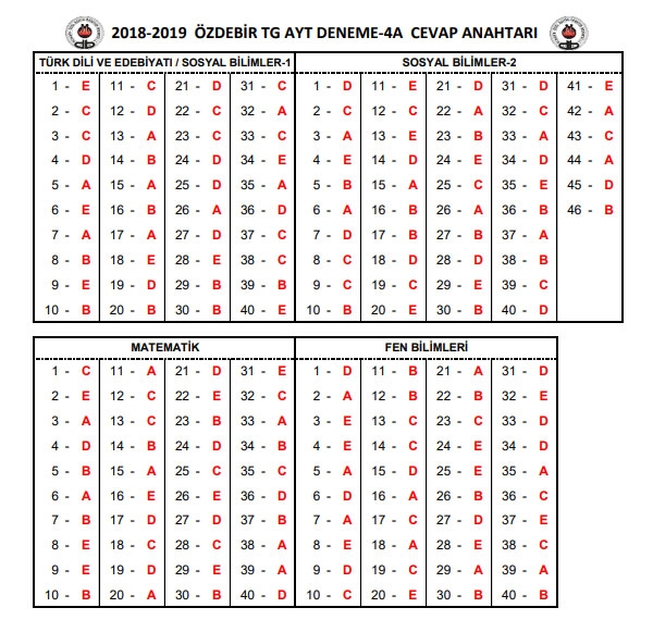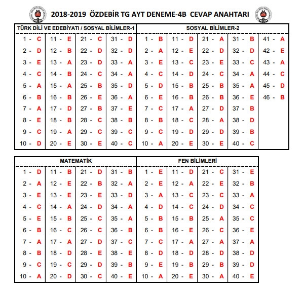 AYT Cevap Anahtarı sonraki sayfadan başlıyor