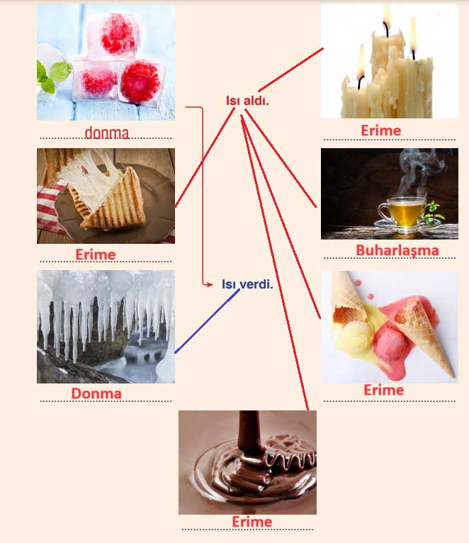 3. Aşağıdaki görselleri inceleyelim. Görsellerdeki maddelerde, erime veya donma olaylarından hangisinin gerçekleştiğini bulalım. Tespitlerimizi görsellerin altına yazalım. Erime veya donma olayı gerçekleşirken çevresinden ısı alan maddeleri “Isı aldı/’ yazısıyla örnekteki gibi eşleştirelim. Erime veya donma olayı gerçekleşirken çevresine ısı veren maddeleri ise “Isı verdi.” yazısıyla eşleştirelim.