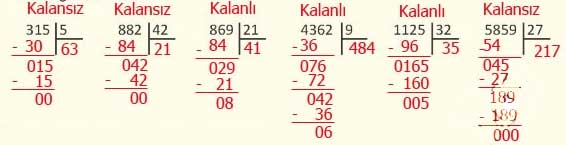 1) Aşağıdaki bölme işlemlerini yapınız. Bölme işlemlerinin kalanlı ya da kalansız olup olmadığını belirtiniz.
