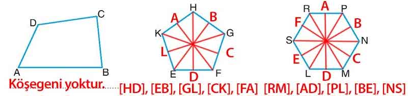 4) Aşağıdaki çokgenlerin köşegenlerini çiziniz. Çizdiğiniz köşegenleri sembolle gösteriniz.