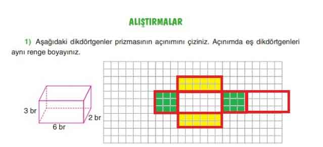 1) Aşağıdaki dikdörtgenler prizmasının açınımını çiziniz. Açınımda eş dikdörtgenleri aynı renge boyayınız.