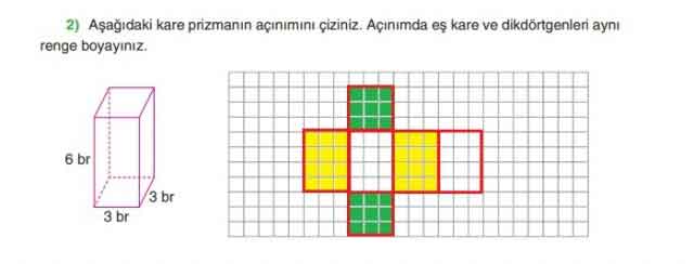 2) Aşağıdaki kare prizmanın açınımını çiziniz. Açınımda eş kare ve dikdörtgenleri aynı renge boyayınız.