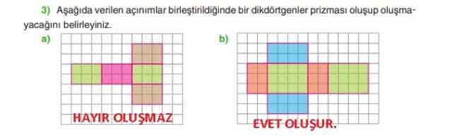 3) Aşağıda verilen açınımlar birleştirildiğinde bir dikdörtgenler prizması oluşup oluşmayacağını belirleyiniz.