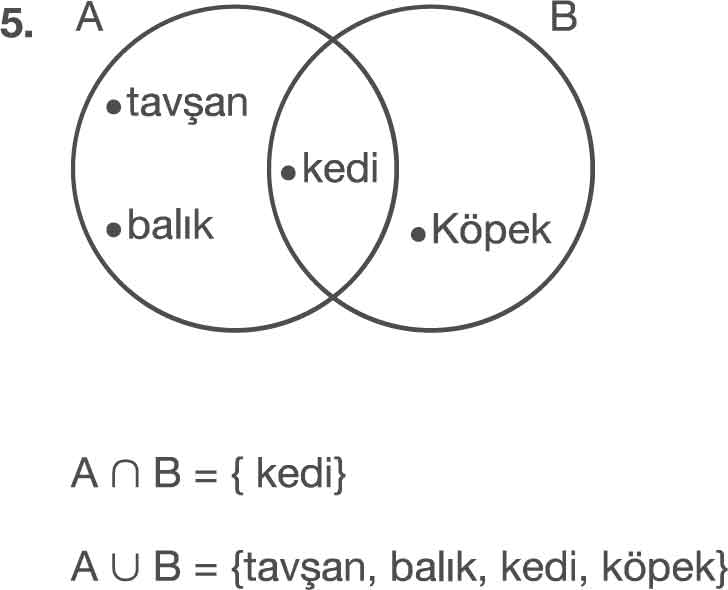5. Ayfer kedi, tavşan ve balık beslemektedir. Bora ise kedi ve köpek beslemektedir. Ayfer ve Bora’nın besledikleri hayvanların kümesini şema ile gösteriniz. Kümelerin kesişimlerini ve birleşimlerini sembol kullanarak yazınız.
