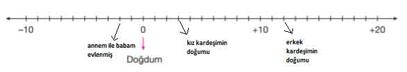 3. Aşağıdaki eş parçalara ayrılmış sayı doğrusunda 0’ı doğduğunuz yıl kabul ederek anne ve babanızın evlendiği yıl, kardeşinizin doğduğu yıl, okula başladığınız yıl gibi sizin için önemli olan tarihlerin yerlerini gösteriniz.