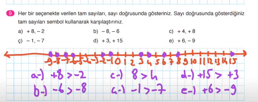 9. Her bir seçenekte verilen tam sayıları, sayı doğrusunda gösteriniz. Sayı doğrusunda gösterdiğiniz tam sayıları sembol kullanarak karşılaştırınız.