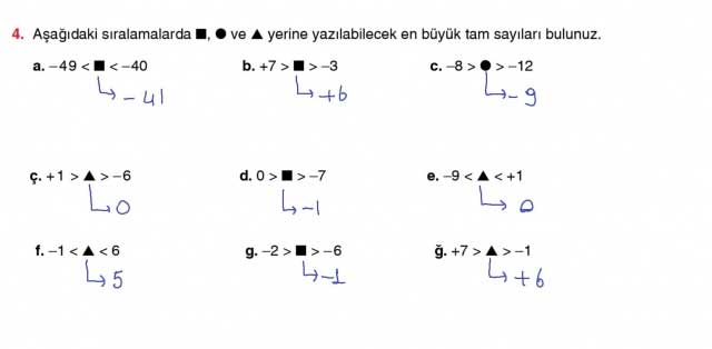 f. –1 < ▲ < 6 g. –2 > ■ > – 6 ğ. +7 > ▲ > –1
