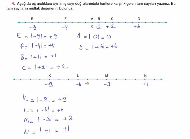 4. Aşağıda eş aralıklara ayrılmış sayı doğrularındaki harflere karşılık gelen tam sayıları yazınız. Bu tam sayıların mutlak değerlerini bulunuz.