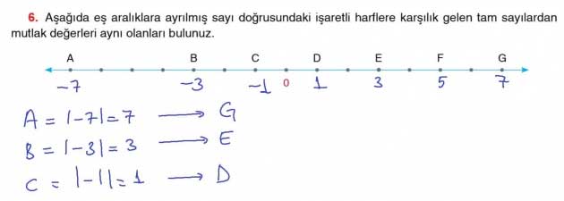 6. Aşağıda eş aralıklara ayrılmış sayı doğrusundaki işaretli harflere karşılık gelen tam sayılardan mutlak değerleri aynı olanları bulunuz.