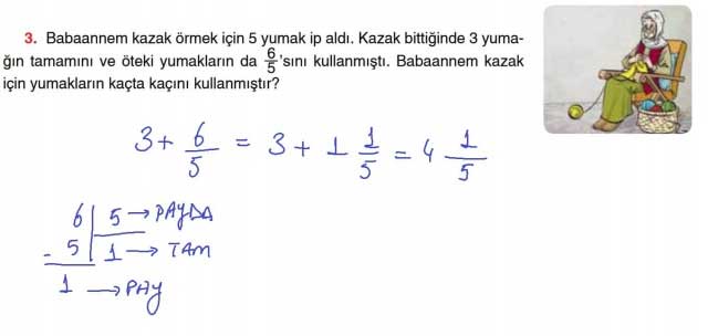 3. Babaannem kazak örmek için 5 yumak ip aldı. Kazak bittiğinde 3 yumağın tamamını ve öteki yumakların da 6/5’sını kullanmıştı. Babaannem kazak için yumakların kaçta kaçını kullanmıştır?