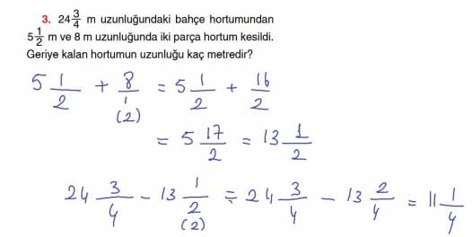 3. 24 tam 3/4 m uzunluğundaki bahçe hortumundan 5 tam 1/2 m ve 8 m uzunluğunda iki parça hortum kesildi. Geriye kalan hortumun uzunluğu kaç metredir?