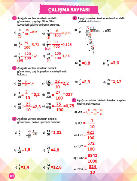 3- Aşağıda verilen kesirlerin ondalık gösterimini, bölme işlemi ile bulunuz.