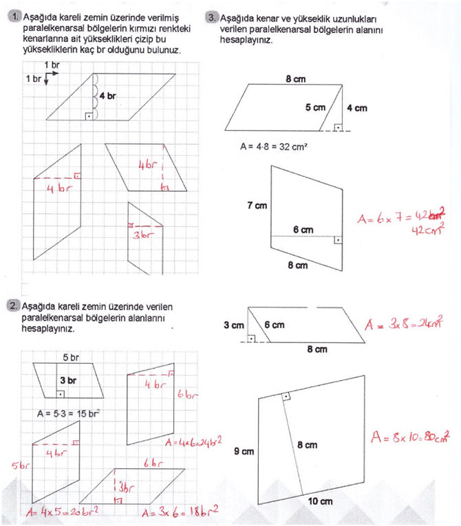 1. Aşağıda kareli zemin üzerinde verilmiş paralelkenarsal bölgelerin kırmızı renkteki kenarlarına ait yükseklikleri çizip bu yüksekliklerin kaç br olduğunu bulunuz.