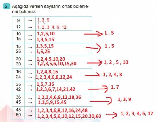 2- Aşağıda verilen sayıların ortak bölenlerini bulunuz.