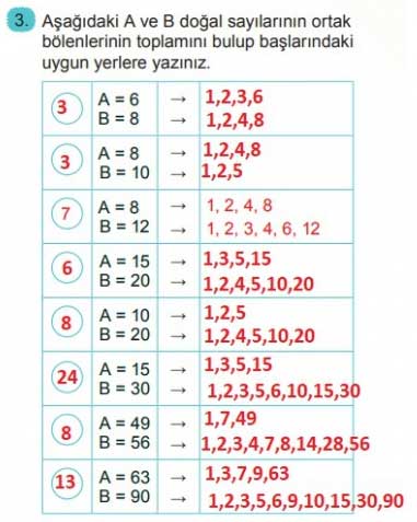 3- Aşağıdaki A ve B doğal sayılarının ortak bölenlerinin toplamını bulup başlarındaki uygun yerlere yazınız.