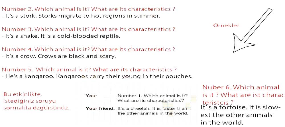 animals. Search the Internet if you need help. (İkili çalışın. Aşağıdakilerin özelliklerini sorun ve cevaplayın hayvanlar. Yardıma ihtiyacınız olursa İnternet'te arama yapın.)