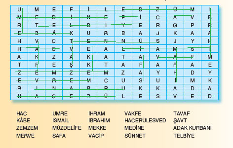 E. Aşağıdaki bulmacada, ünitede gördüğünüz bazı isim, kavram ve ifadeler gizlenmiştir. Bunları bulup renkli kalemle işaretleyiniz. Bunun için bulmacayı sağdan sola, soldan sağa, aşağıdan yukarıya ve yukarıdan aşağıya taramalısınız.