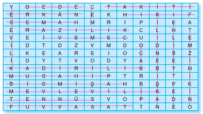 D. Aşağıdaki bulmacada, işlediğiniz ünitede karşılaştığınız bazı isim, kavram ve ifadeler gizlenmiştir. Bunları bulup renkli kalemle işaretleyiniz. İsim, kavram ve ifadeleri bulabilmek için bulmacayı soldan sağa, sağdan sola, yukarıdan aşağıya, aşağıdan yukarıya ve çapraz taramalısınız.