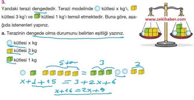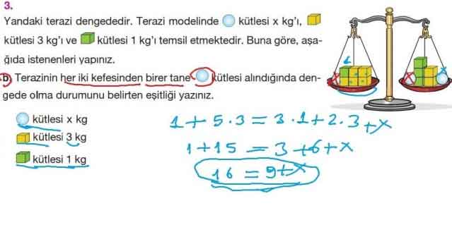 3. Yandaki terazi dengededir. Terazi modelinde kütlesi x kg’ı, kütlesi 3 kg’ı ve kütlesi 1 kg’ı temsil etmektedir. Buna göre, aşağıda istenenleri yapınız.