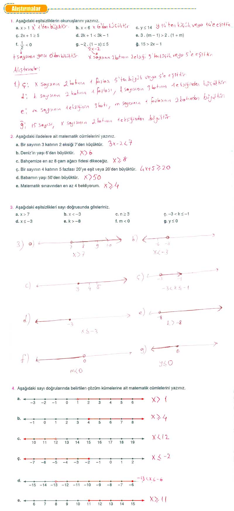 a. x > 7 b. x < – 3 c. n ≥ 3 ç. –3 < k ≤ –1