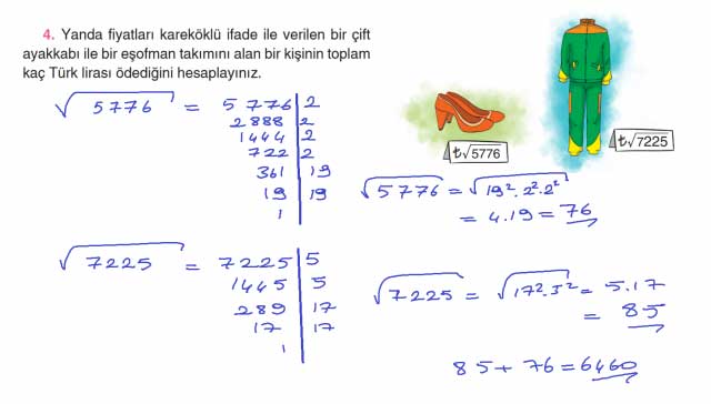 4. Yanda fiyatları kareköklü ifade ile verilen bir çift ayakkabı ile bir eşofman takımını alan bir kişinin toplam kaç Türk lirası ödediğini hesaplayınız.