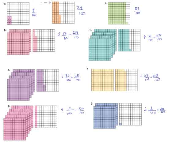1. Aşağıdaki bütünlerin boyalı kısımlarını gösteren ondalık gösterimleri yazınız. Bu ondalık gösterimlere karşılık gelen rasyonel sayıları da a/b biçiminde yazınız.