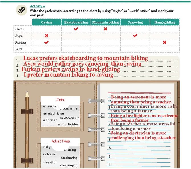 Write the preferences according to the chart by using “prefer” or “would rather” and mark your own par (Tercihleri grafiğe göre "tercih" veya "tercih eder" kullanarak yazın ve kendi paranızı işaretleyin.)