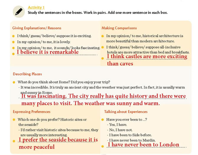 Study the sentences in the boxes. Work in pairs. Add one more sentence in each box. (Kutulardaki cümleleri inceleyin. İkili çalışın. Her kutuya bir cümle daha ekleyin)