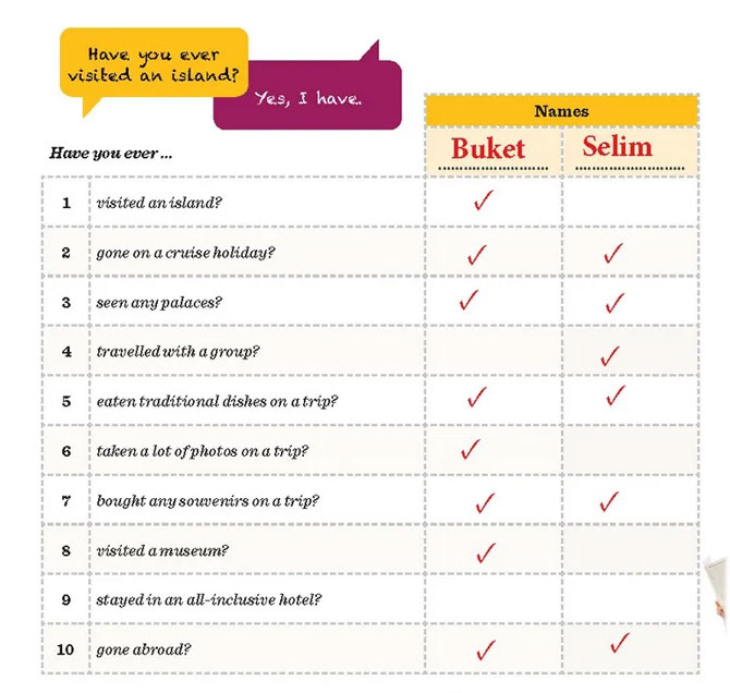 Go around in the classroom. Ask the questions to two of your friends. Tick ( ) their answers in the chart. (Sınıfta dolaşın. Soruları iki arkadaşınıza sorun. Cevaplarını çizelgede işaretleyin ().)