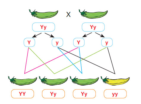 3) Aşağıda yeşil renkli bezelyelerin çaprazlanması ve çaprazlanma sonucu oluşan bezelyeler verilmiştir. Buna göre noktalı yerlere bezelyelerin genotiplerini yazınız. (Yeşil meyve rengine sahip bezelyeler “Y”, sarı meyve rengine sahip bezelyelere “y” baskındır.):