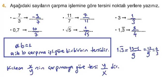 4- Aşağıdaki sayıların çarpma işlemine göre tersini noktalı yerlere yazınız.