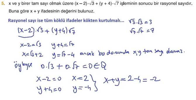 5- x ve y birer tam sayı olmak üzere (x – 2) - √3 + (y + 4) - √7 işleminin sonucu bir rasyonel sayıdır. Buna göre x + y ifadesinin değerini bulunuz.