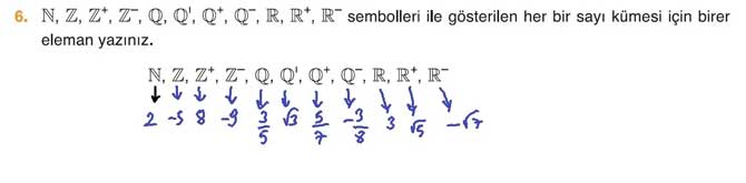 6- N, Z, Z+, Z-, Q, Q', Q+, Q-, R, R+, R- sembolleri ile gösterilen her bir sayı kümesi için birer eleman yazınız.