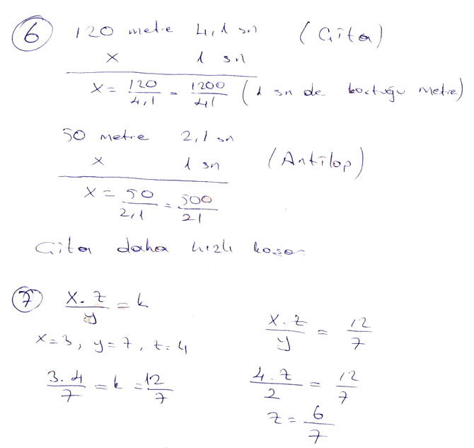6. Bir çita 120 metreyi 4,1 saniyede, bir antilop 50 metreyi 2,1 saniyede koşabilmektedir. Hangisinin daha hızlı olduğunu bulunuz.