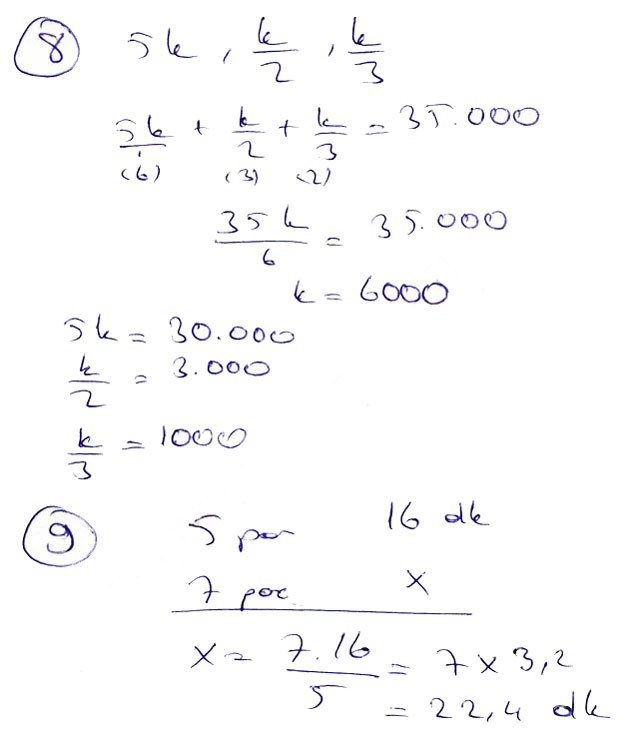 8. 35 000 m arsası bulunan Cenk Bey arsasını satmak istiyor. Bu arsayı 5 ile doğru, 2 ve 3 ile ters orantılı olacak şekilde 3 parçaya ayırıyor. Her bir parçanın kaç metrekare olduğunu bulunuz.