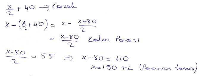 Şükran parasının yarısından 40 TL fazlası ile kazak alı- Si-zd-e. y0r Kalan parasının tamamı ile fiyatı 55 TL olan eteği alıyor. Şükran’ın başlangıçta kaç lirası vardı?