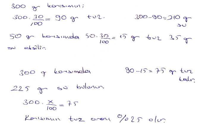 Tuz oranı %30 olan 300 gr tuzlu su karışımından 50 gram alınıp yerine aynı miktarda saf su ekleniyor.Elde edilen karışımın tuz oranı yüzde kaç olur?