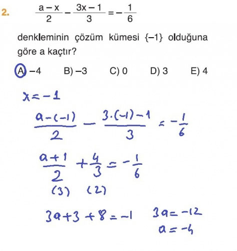 2. …..denkleminin çözüm kümesi {-1} olduğuna göre a kaçtır?