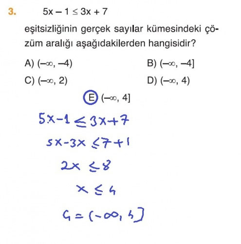 3. ………..eşitsizliğinin gerçek sayılar kümesindeki çözüm aralığı aşağıdakilerden hangisidir?